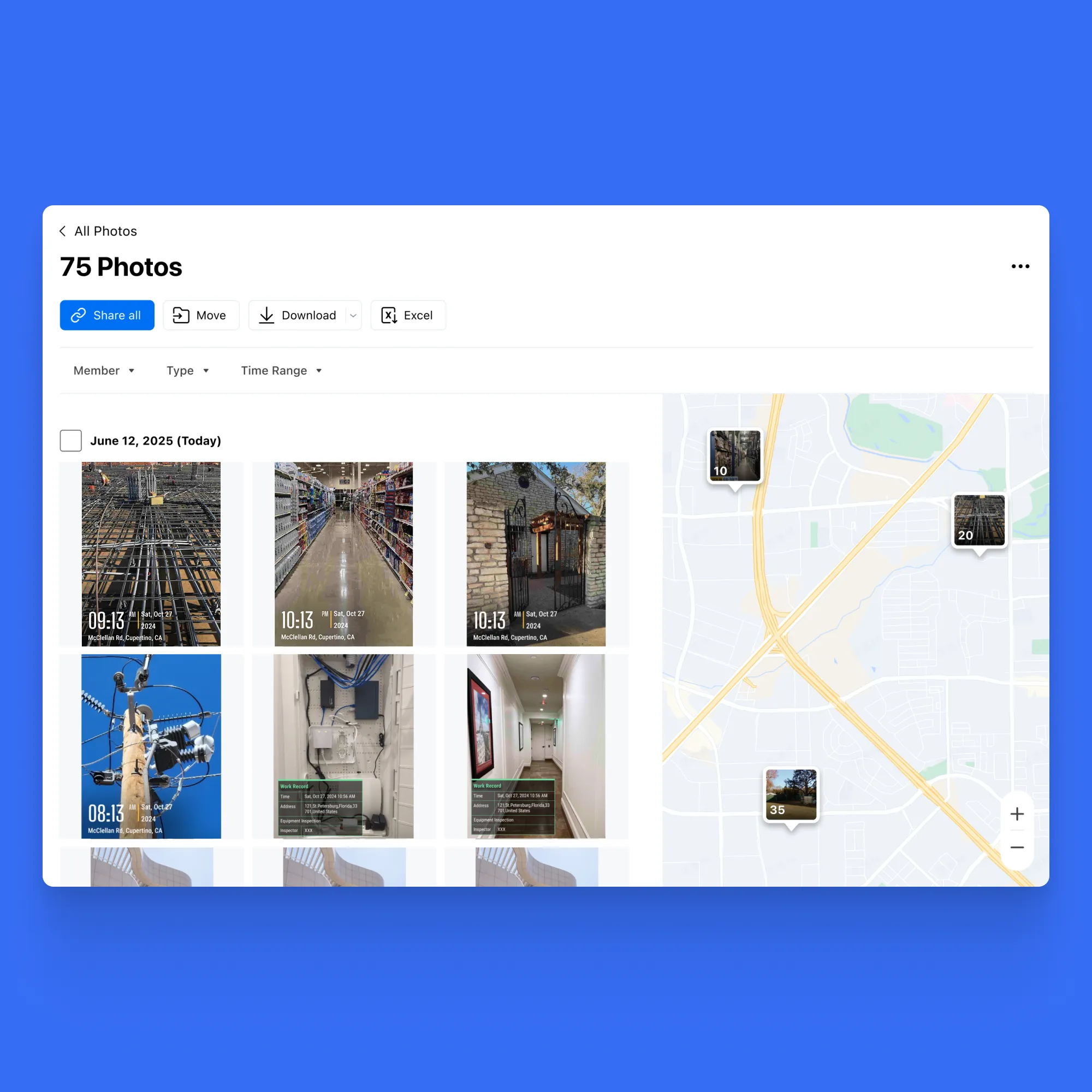 • Quick Location Insights: See where work happened, compare locations, and spot missing coverage, without opening photos one by one.